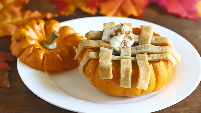 - Mini pumpkins are a cute and fun way to serve up this classic dessert. I love Autumn. The colorful leaves, the foggy mornings, the cool mist that settles on the ground at night. Everything about it creates the perfect atmosphere for baking in the kitchen and filling your home with the warm, sweet and spicy aromas of the holidays. Another thing I love about Autumn is the bounty of colorful squash. All different colors, shapes and sizes, squash is a vegetable that's not only beautiful, healthy and delicious, but it's also nostalgic. What images and memories does the word "pumpkin" bring to your mind? It means lots of fun childhood memories for me and a home filled with the smell or all kinds of delicious pumpkin baked goods. And of course there's nothing that spells Autumn baking better than a homemade pumpkin pie. Here's an original twist on traditional pumpkin pie: Your favorite pumpkin pie filling baked inside of a mini pumpkin and topped with a wonderfully flaky lattice pie crust. They're not only delicious, they're beyond adorable! Serve these to your guests and watch their eyes light up with delight as their very own mini pumpkin lattice pie is placed in front of them.
