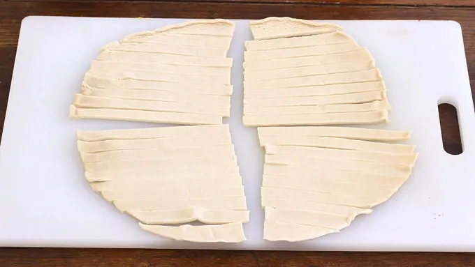Step5To make the lattice, unroll the Pillsbury pie crust and cut it into quarters. Then slice each quarter into thin strips.