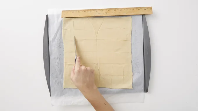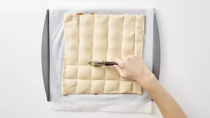 Use a knife to lightly score 2 x 2-inch squares on the dough. Brush surface of dough with 1 beaten egg (save remaining beaten egg for the top crust).