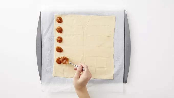 In a large bowl, stir together pumpkin puree, 1 egg, brown sugar and pumpkin pie spice. Spoon filling into the center of each scored square.