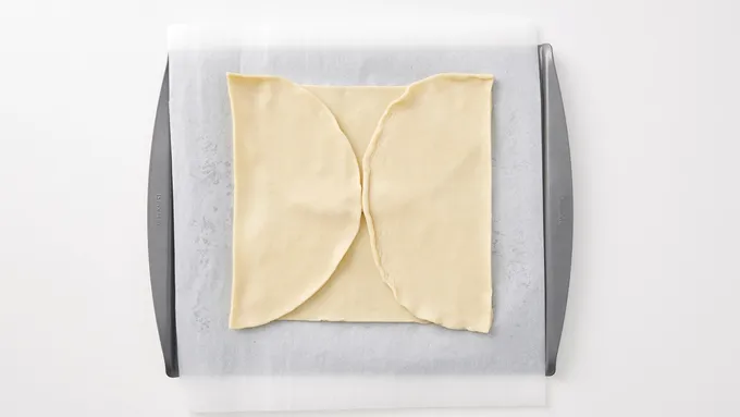 Heat oven to 400°F. Line workspace with a large piece of parchment. Open first box of pie crust and unroll both crusts. Slice each in half, then arrange the halves, rounded edges facing in toward the center, to create a large square (crusts may overlap a bit). With a rolling pin, roll the square into a rectangle.