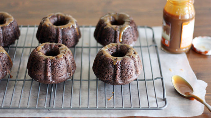 Step4Remove cakes from oven; cool 10 minutes, then invert onto a cooling rack. Using the back of a spoon, poke a few holes in the top of each cake, being careful not to poke all the way through the bottom. Carefully pour about a teaspoon of caramel sauce over the top of each cake; let cakes cool completely and caramel soak in.