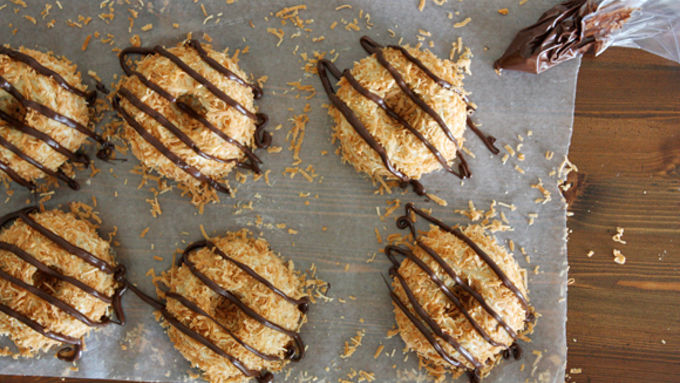 Step7Place chocolate chips in a small, microwave-safe bowl. Microwave 30 seconds, then stir; melt another 10 seconds at a time until chips are fully melted. Pipe melted chocolate onto cakes in lines so they look like Girl Scout Samoa cookies.