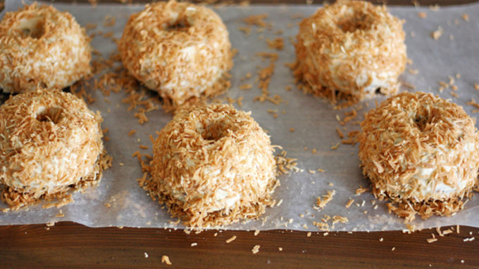 Step6Heat oven to 350°F; place coconut flakes on a rimmed baking sheet and toast, stirring occasionally, until a deep caramel brown. Let cool completely, then use your hands to pat the coconut flakes onto each frost cake; cover completely.