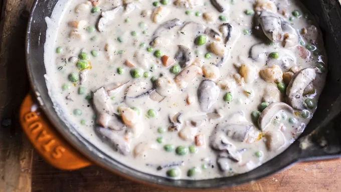 To the same skillet, add butter. Once melted, add mushrooms and carrots. Cook for 5-8 minutes or until the carrots are soft. Stir in fresh thyme and cook another minute. Add flour and continue cooking a minute longer. Slowly pour in the wine and milk, whisking to ensure that no clumps form in sauce. Bring sauce to a low boil. Reduce heat and stir in peas and cooked shrimp. Simmer sauce for 5 minutes or until thickened. Remove from heat and let cool.