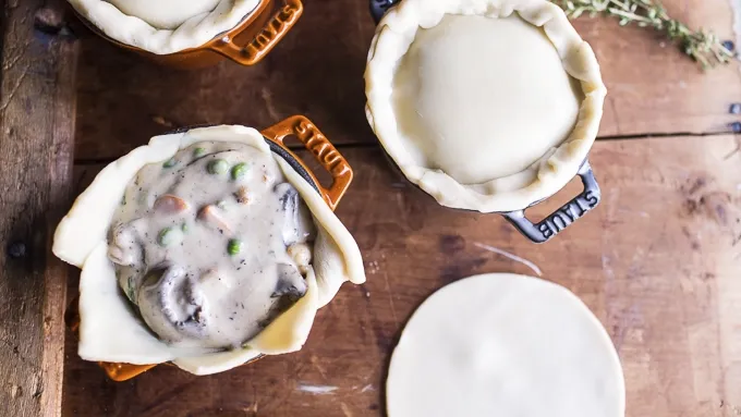Unroll the rounds of pie dough and cut each round of dough into four triangles. Use your hands to fit half of the triangles inside the greased ramekins. Cut remaining triangles into 3 to 4 inch circles. Divide pot pie filling evenly among each ramekin. Place top piece of pie dough over the filling and pinch the two pieces of dough together to seal. Use the tines of a fork to create a rustic design going all the way around the pot pies.