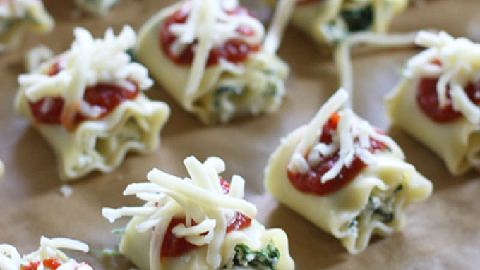 Bite-sized spinach lasagna roll-ups served with pizza sauce for dipping.