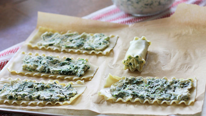 Pat noodles dry with a paper towel and lay them on parchment or wax paper. Cut each noodle in half widthwise. Fill each noodle piece with 2-3 tablespoons of the ricotta mixture, leaving an inch empty on one side of the noodle. Start rolling each noodle up, ending on the side that has one inch empty. (This is so that filling doesn't spill out the end of your rolls.)