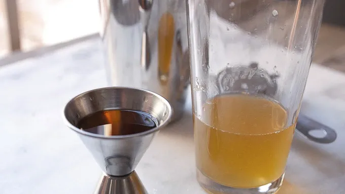 Step2To make a cocktail, add 1 ounce mint simple syrup, lemon juice and bourbon whiskey to a shaker glass with lots of ice. Shake to chill.
