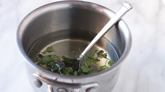Step1For mint simple syrup, combine sugar, water and mint sprigs in small saucepan and heat while stirring regularly until sugar is dissolved. Once sugar is dissolved, remove from heat and let cool to room temperature. Then remove mint sprigs.