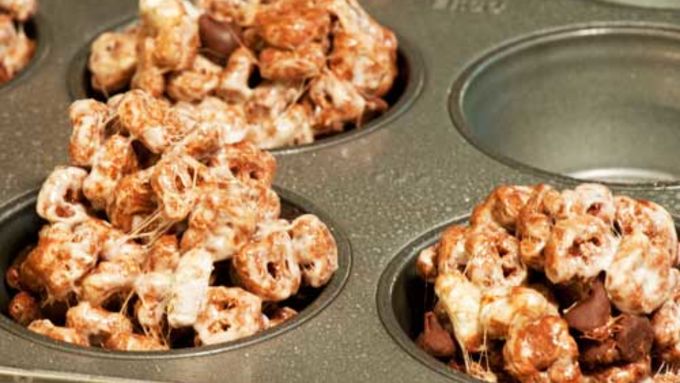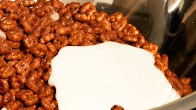 Step1Grease two cookie sheets or 2 muffin tins and place each cereal in a separate, heatproof bowl.