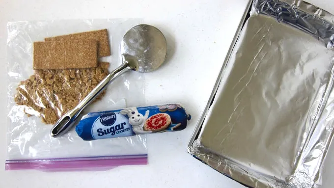 Step2GRAHAM CRACKER COOKIE: Break the graham crackers into very small pieces or large crumbs. Mix the graham crackers into the Pillsbury™ refrigerated Sugar Cookie Dough. Press into the pan. Bake for 20-24 minutes until lightly golden brown. Allow cookie to cool completely in pan.