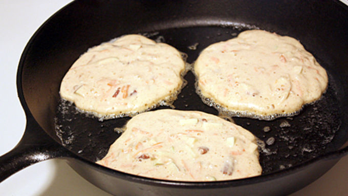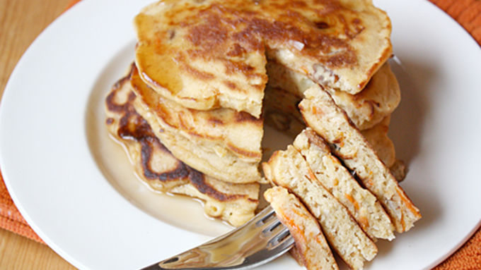 - What’s the story, morning glory? My story includes two things: Me, and these amazing Morning Glory Pancakes. They’re a twist on classic, delicious Bisquick pancakes mixed with quintessential, wholesome ingredients you’d find in your favorite morning glory breakfast muffin. Part of me was hesitant to tamper with the amazing original pancake recipe – after all, it’s been in every Betty Crocker cookbook since 1950! Who could top that? But what’s great about these Morning Glory Pancakes is even though they contain a handful of extra ingredients, the signature pancake flavor still shines through. It’s a veritable pancake miracle. I don’t know what it is about the combination of raisins, coconut, carrots, apples and nuts that makes for a yummy breakfast treat, but whatever it is, it works. The pancake texture is equal parts crunchy and fluffy, with a dynamic flavor palate of sweet and savory all at once. You can top your pancakes with a dollop of maple syrup, powdered sugar or fresh fruit, or eat them plain – the flavors hold up on their own. I suggest pairing a few of these with some bacon for a serious sweet-and-savory breakfast. Two things to keep in mind when making your pancakes: One, don’t overmix the batter. Even though there may be a few lumps left, it’s worth it to render the tenderest pancakes. And two, be sure to wait for bubbles to form on the top of the batter when you’ve got the pancakes on the griddle – that’s a sure sign it’s cooking all the way through. With extra mix-ins, it can take a little bit longer to cook the pancakes in the middle. The next time you’ve got a hankering for a glorious breakfast, make these Morning Glory Pancakes. They’re worth getting out of bed for!