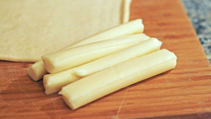 Step3Cut each of the mozzarella sticks into two pieces. Place each on one of the Crescents rectangles. Roll the dough around the mozzarella sticks and press the edges to seal. Place each one onto the parchment-lined baking sheet.