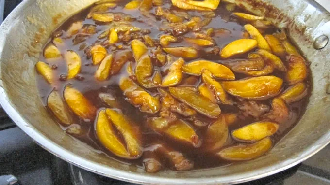 Step2GLAZED PEACHES: Heat butter in a skillet set over medium-high heat. Once melted, stir in both sugars and allow to dissolve. Toss in peach slices, cinnamon and nutmeg. Bring to a boil, then reduce heat to medium-low and cook until peaches are tender, 10-16 minutes. Remove from heat and allow to cool completely.