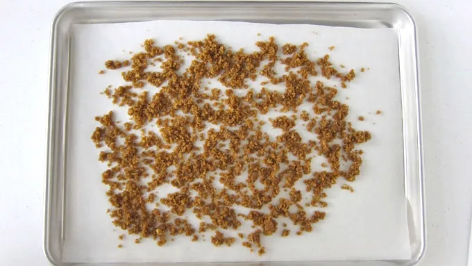 Step4BROWN SUGAR CAKE CRUMBLES: Preheat oven to 350°F. Cut off the domed portion of each cake and crumble the tops into very small pieces. Measure out 3/4 cup crumbs and mix with brown sugar, cinnamon and melted butter. Spread out into a thin layer on a baking sheet. Bake for 10 minutes, then remove and stir. Bake an additional 6-10 minutes until fragrant and deep golden brown. Remove and allow to cool completely.