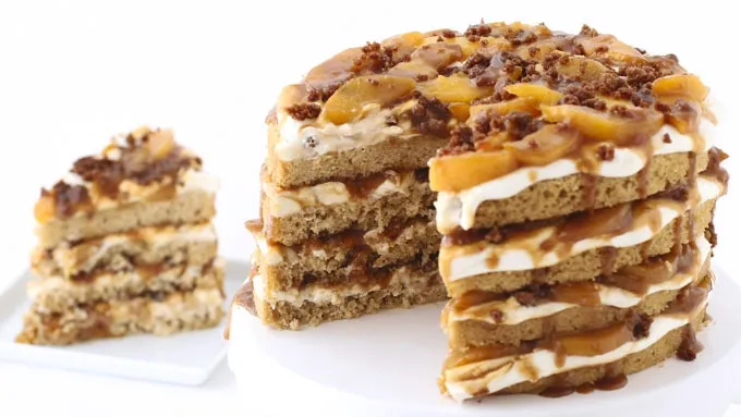 - Go ahead, do a double-take. Want an over-the-top way to make peach cobbler that won’t take you all day to decorate? This four-layer, cinnamon-infused yellow cake topped with cheesecake filling, caramelized peaches and brown sugar cake crumbles couldn’t be more amazing. This dessert combines peach cobbler together with cheesecake in the most striking way. The cakes are left “naked” (not frosted) so you can see all those sweet peaches and gooey caramel sauce dripping down over layers of cake and cheesecake filling. You will make this once, then won’t be able to resist making it again and again and again. It’s that good. So go grab some peaches and a Betty Crocker™ Yellow Cake Mix and get baking. Keep the leftovers (if you have any) in the refrigerator for up to four days.