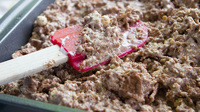 Step2Place cereal in a food processor. Pulse until crushed. Pour crushed crumbs into the melted marshmallows. Stir until well-melted and combined, removing pot from heat.