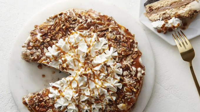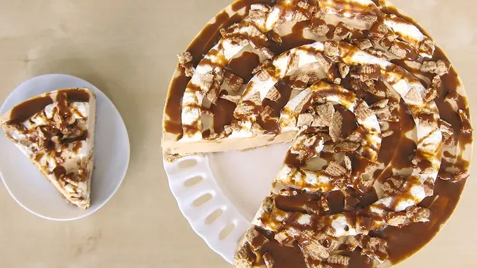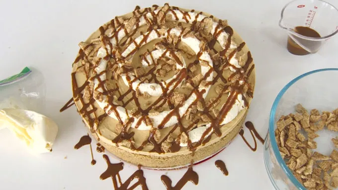 Break Cinnamon Toast Crunch™ cereal into small pieces. Spoon whipped topping into a zip-top bag and snip off one corner. Pipe whipped topping in a swirl over the cheesecake, sprinkle on the cereal pieces, and drizzle the caramel or dulce de leche sauce over the top.