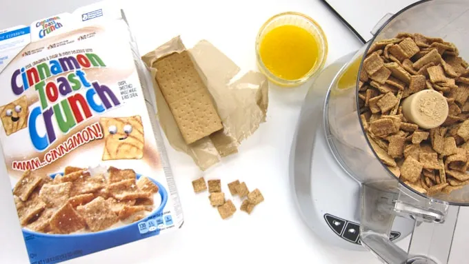 Pulse until you have fine crumbs. If you don't have a food processor you can simply place the graham crackers and cereal in a large zip-top bag and smash into crumbs using a rolling pin or the back of a pan.