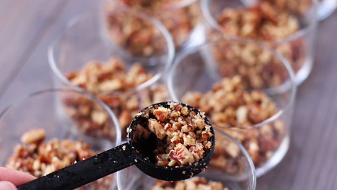 Step2Reserve about 8 pecans to top the cheesecakes if desired. Then crumble the rest by hand or in a food processor. Toss together the crumbled pecans with the melted butter, brown sugar and sea salt until combined. Then portion the pecan crust evenly into your serving dishes or ramekins, and press down lightly to flatten. (I used about 2 tablespoons per serving dish.)