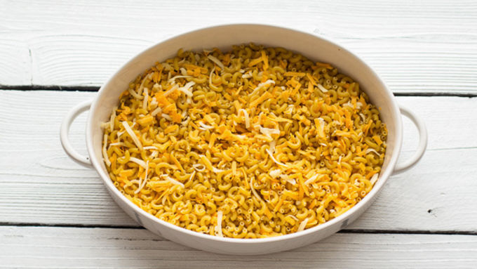 Step2Add the pasta and about 1 cup of cheddar cheese to the prepared baking dish, set aside.