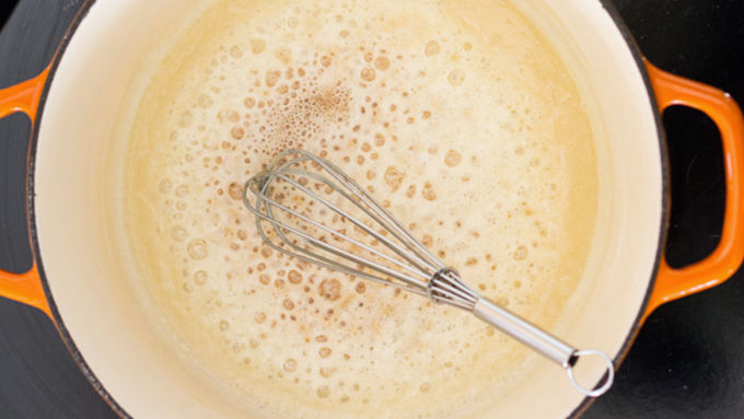 Step3Melt 4 tablespoons butter in a large saucepan over medium-high heat. Add flour, whisking constantly, for about 2 minutes. Whisk in milk and 1 1/2 cups water. Bring to a boil, reduce heat to a simmer, and cook, whisking often, until a very thin, glossy sauce forms, about 10 minutes. Stir in the mustard powder, cayenne pepper (if using), salt and pepper. Remove the sauce from the heat. Stir in the remaining 2 1/2 cups of cheddar cheese until smooth.