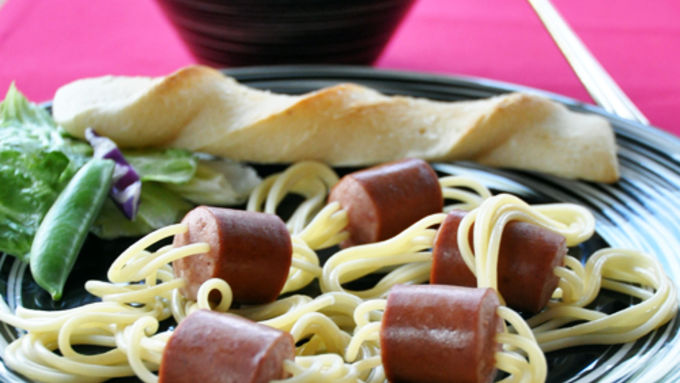 - These Noodle Weenies are a silly and fun way to get creative with dinner! Inspired by this article we found on Helablog.com we had to give these Noodle Weenies a try! You can make these at Mach 2 (that's fast). And oh yeah, they are way fun -- and easy too. Kids and adults alike will try to figure out how you shoved those limp little lengths of pasta through their husky hunks of hot dog! No need to spill the beans -- it can be your secret. If your kids are younger than 10, they might even think you're a cooler wizard than Harry Potter. No need to add salt or oil to the water for boiling. The hot dogs will take care of that stuff. Tip: Don't push the noodles down into the water or they will break and ruin the concept! Let them cook down until soft, then gently stir them now and then just to keep them from getting too cozy with each other. Cook per directions on the pasta package. Use tongs to remove each weenie from the water, or drain the whole batch in a colander. Serve with a small salad, Muir Glen™ pasta sauce, and Pillsbury™ breadsticks on the side. Now if they'd only had this recipe back when they wrote the song, "On top of spaghetti, all covered with cheeeeese..." Yep. They wouldn't have lost that poor meatball when somebody sneezed.