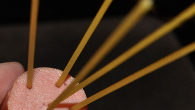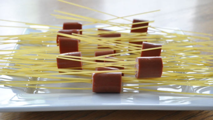 Step2Slide 5 spaghetti noodles into each hot dog chunk, threading the meat about half-way onto the noodle (so equal lengths of noodle are on both sides of the hot dog chunk). Repeat until all noodles and hot dog pieces are threaded.