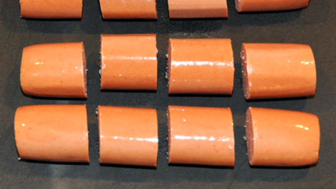 Step1With a sharp knife, slice the rounded ends off of the hot dogs, then slice each hot dog into 4 equal chunks.