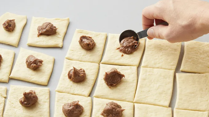 Step3Unroll 1 can of dough into 1 large rectangle. Cut rectangle into 6 rows by 3 rows, to make 18 pieces. Place 1 teaspoon cream cheese mixture in middle of each rectangle. Fold dough over filling (do not stretch dough), and gently pinch to seal around filling; roll into ball. Repeat with second can of dough.