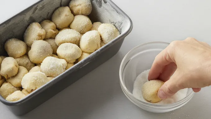 Step4In small bowl, place remaining 1/4 cup granulated sugar. Roll dough balls in sugar until coated. Place sugar-coated dough balls in pan. Sprinkle any remaining sugar over dough.