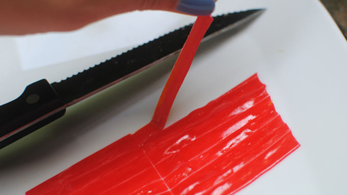 Step2Unroll the Betty Crocker™ Fruit Roll-Ups™ and cut into equal strips. Make them the width and length that will work for the flag stripes.