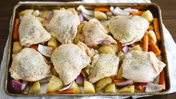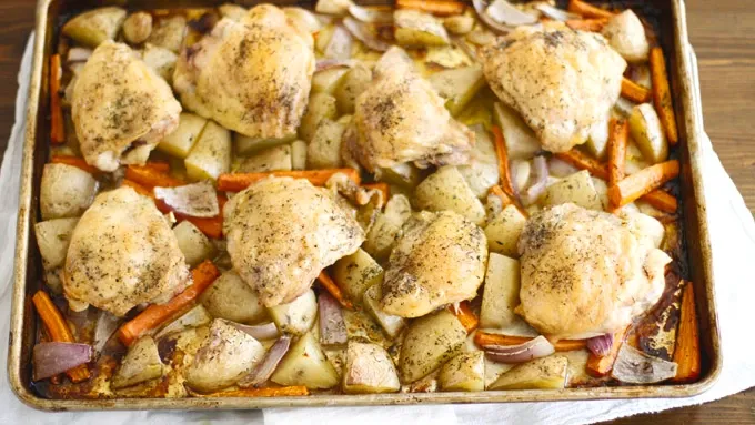 var configuration = {"title":"One-Pan Crispy Chicken Thighs with Roasted Vegetables","introduction":"Crispy chicken thighs and caramelized vegetables all baked on one sheet pan.","servingSize":"1 Serving","image":{"small":{"media":"(min-width: 0px)","src":"https://mojo.generalmills.com/api/public/content/bD_pqgmC5kCoK2_5AJv1gg_webp_base.webp?v=df97ef7a\u0026t=e724eca7b3c24a8aaa6e089ed9e611fd"},"medium":{"media":"(min-width: 500px)","src":"https://rms-media-prod.generalmills.com/f41261c7-34f2-4470-8d10-946cb17417b7.jpg"},"large":{"media":"(min-width: 767px)","src":"https://rms-media-prod.generalmills.com/f41261c7-34f2-4470-8d10-946cb17417b7.jpg"},"alt":"One-Pan Crispy Chicken Thighs with Roasted Vegetables"},"contributor":{"label":"by:","name":"Girl vs Dough","displayDate":{"label":"Updated","date":"Mar 7, 2017"}},"ingredientGroups":[{"ingredients":[{"quantity":"2","description":"lbs Yukon gold potatoes, halved and quartered"},{"quantity":"4","description":"to 5 carrots, peeled, halved and quartered"},{"quantity":"1","description":"red onion, halved and quartered"},{"quantity":"1","description":"garlic bulb, cloves separated and skins removed"},{"quantity":"4","description":"tablespoons olive oil, divided"},{"quantity":"3 1/2","description":"to 4 lbs skin-on, bone-in chicken thighs"},{"quantity":"","description":"Salt and pepper"},{"quantity":"1","description":"teaspoon dried thyme"},{"quantity":"1/2","description":"teaspoon dried oregano"},{"quantity":"1/2","description":"teaspoon dried parsley flakes"}]}],"steps":[{"description":"Heat oven to 450°F."},{"description":"In a large bowl, toss potatoes, carrots, onion and garlic with 3 tablespoons olive oil. Spread in an even layer on a large rimmed baking sheet.","stepShotImageUrl":"//mojo.generalmills.com/api/public/content/oCFHAmwjfUeLXvgXtsghJw_webp_base.webp?v=c828dddb\u0026t=3653fe2f5ecd4a47a5a51c97e429947c"},{"description":"Use paper towel to blot chicken thighs to remove excess moisture. Arrange chicken thighs on top of vegetables, and brush chicken skin with remaining 1 tablespoon olive oil. Sprinkle thighs generously with salt and pepper. Sprinkle thyme, oregano and parsley flakes evenly over thighs and vegetables.","stepShotImageUrl":"//mojo.generalmills.com/api/public/content/2XG5RNoP6kav4oYpIaP12w_webp_base.webp?v=6da776a6\u0026t=3653fe2f5ecd4a47a5a51c97e429947c"},{"description":"Bake on center rack of oven 40 to 45 minutes until an internal thermometer inserted in center of largest piece of chicken reads 175°F, chicken skin is crispy and browned and vegetables are tender.","stepShotImageUrl":"//mojo.generalmills.com/api/public/content/aHQFHlPRsUacOswxOD13kg_webp_base.webp?v=a92ca0f8\u0026t=3653fe2f5ecd4a47a5a51c97e429947c"}],"tips":[{"title":"","description":"Serve chicken and vegetables with a big green salad for a complete meal.","category":"Serving Suggestions/Menu","tipShots":[]},{"title":"","description":"Other skin-on, bone-in chicken pieces – such as wings, legs and breasts – can be substituted for thighs, but be sure to adjust baking time accordingly (i.e., smaller pieces of chicken will bake faster).","category":"Substitution","tipShots":[]},{"title":"","description":"Make your main and sides in a single pan. Here\u0027s how with easy One-Pan Crispy Chicken Thighs with Roasted Vegetables!\r\n\r\nHave you heard? There\u0027s this newfangled invention — it’s called cooking everything all at once on a sheet pan! Oh wait, that’s nothing new? Huh. Well, we\u0027re still very excited about it, and you should be too.\r\n\r\nLike most people, we want nothing more at the end of a long day than curl up on the couch, maybe watch some Netflix, and not spend all evening standing at the stove.\r\n\r\nBut we still want to eat a decent meal that doesn’t include popcorn or a block of cheese. So what to do? Call on the trusty sheet pan and make these one-pan chicken thighs with roasted vegetables, that’s what.\r\n\r\nThis recipe not only bakes everything together all at once, but it serves a whole family or an extra couple of friends for a dinner party. Just add a big green salad, maybe a bottle of wine and voila! Dinner = served.\r\n\r\nWe used a combination of Yukon gold potatoes, carrots, red onion and garlic cloves, but what’s great about this recipe is it’s incredibly versatile – so swap the gold potatoes for red or Russets, swap the red onion for yellow, add Brussels sprouts to the mix, etc.\r\n\r\nServe chicken and vegetables with a big green salad for a complete meal.\r\n\r\nOther skin-on, bone-in chicken pieces – such as wings, legs and breasts – can be substituted for thighs, but be sure to adjust baking time accordingly (i.e., smaller pieces of chicken will bake faster).\r\n\r\nNewfangled or old-fashioned, this sheet pan meal is one that will go on repeat again and again.","category":"Editorial","tipShots":[]}],"kitchenTips":[{"title":"","description":"Serve chicken and vegetables with a big green salad for a complete meal.","category":"Serving Suggestions/Menu","tipShots":[]},{"title":"","description":"Other skin-on, bone-in chicken pieces – such as wings, legs and breasts – can be substituted for thighs, but be sure to adjust baking time accordingly (i.e., smaller pieces of chicken will bake faster).","category":"Substitution","tipShots":[]}],"additionalContent":[],"faq":[],"tipCategories":[{"categoryName":"Editorial","heading":"More About This Recipe","cssClass":"recipePartStory","expandOnInit":false,"expandText":"More +","collapseText":"Less -","expandEventName":"","collapseEventName":"","image":"","tips":[{"title":"","description":"Make your main and sides in a single pan. Here\u0027s how with easy One-Pan Crispy Chicken Thighs with Roasted Vegetables!\r\n\r\nHave you heard? There\u0027s this newfangled invention — it’s called cooking everything all at once on a sheet pan! Oh wait, that’s nothing new? Huh. Well, we\u0027re still very excited about it, and you should be too.\r\n\r\nLike