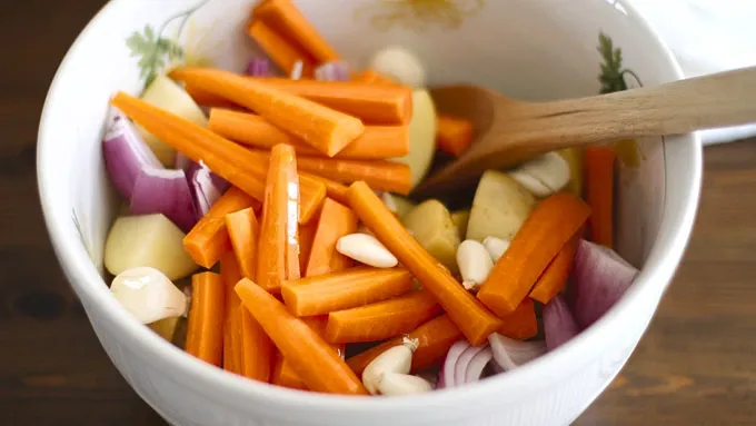 In a large bowl, toss potatoes, carrots, onion and garlic with 3 tablespoons olive oil. Spread in an even layer on a large rimmed baking sheet.