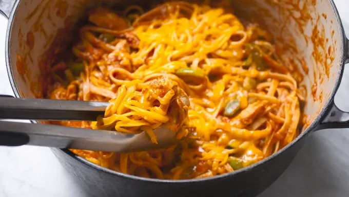 var configuration = {"title":"One-Pot Cheesy Chicken Fettuccine","introduction":"A fresh Tex-Mex twist on chicken fettuccine!","servingSize":"1 Serving","image":{"small":{"media":"(min-width: 0px)","src":"https://mojo.generalmills.com/api/public/content/bOnSMLuX7UKKuynuyP8G-g_webp_base.webp?v=37456482\u0026t=e724eca7b3c24a8aaa6e089ed9e611fd"},"medium":{"media":"(min-width: 500px)","src":"https://rms-media-prod.generalmills.com/b358b55b-fb65-4d45-8398-dc77c8a5e1e4.jpg"},"large":{"media":"(min-width: 767px)","src":"https://rms-media-prod.generalmills.com/b358b55b-fb65-4d45-8398-dc77c8a5e1e4.jpg"},"alt":"One-Pot Cheesy Chicken Fettuccine"},"contributor":{"label":"by:","name":"Macheesmo","profileUrl":"/contributors/macheesmo","displayDate":{"label":"Updated","date":"Nov 25, 2016"}},"ingredientGroups":[{"ingredients":[{"quantity":"1/2","description":"lb fettuccine"},{"quantity":"2","description":"tablespoons olive oil"},{"quantity":"1","description":"lb chicken breast, sliced"},{"quantity":"1","description":"packet (1 oz) Old El Paso™ Original Taco Seasoning Mix"},{"quantity":"1/2","description":"yellow onion, diced"},{"quantity":"1","description":"small green pepper, sliced thin"},{"quantity":"2","description":"cloves garlic, minced"},{"quantity":"1/2","description":"cup tomato sauce"},{"quantity":"","description":"Salt and pepper"},{"quantity":"8","description":"oz cheddar cheese, grated"},{"quantity":"","description":"Fresh cilantro, for garnish"}]}],"steps":[{"description":"In a sturdy pot, cook fettuccine until it’s al dente in salted water. Drain pasta and toss pasta with cold water to stop the cooking.","stepShotImageUrl":"//mojo.generalmills.com/api/public/content/TtSllxRVtUiXxd1kelD6EQ_webp_base.webp?v=e4a9354d\u0026t=3653fe2f5ecd4a47a5a51c97e429947c"},{"description":"In the same pot, add olive oil over medium heat. Add chicken and cook until chicken is cooked through, about 8 minutes, stirring occasionally. Use a large spoon or tongs to break up chicken as it cooks.","stepShotImageUrl":"//mojo.generalmills.com/api/public/content/AlGR0Lsrr0aOJnKQoCR6og_webp_base.webp?v=11968196\u0026t=3653fe2f5ecd4a47a5a51c97e429947c"},{"description":"Add taco seasoning to the skillet along with 1/2 cup of water. Then add onions, peppers and garlic and cook for 3-4 minutes until veggies start to soften.","stepShotImageUrl":"//mojo.generalmills.com/api/public/content/P5EZ0hyH9E2RSpJ10EzkvQ_webp_base.webp?v=17c2fa70\u0026t=3653fe2f5ecd4a47a5a51c97e429947c"},{"description":"Stir in tomato sauce and season with salt and pepper.","stepShotImageUrl":"//mojo.generalmills.com/api/public/content/2X2o9esB70WfaqbCqM2QcA_webp_base.webp?v=3e174f86\u0026t=3653fe2f5ecd4a47a5a51c97e429947c"},{"description":"Add cooked fettuccine back into the pot and stir to combine. If the mixture looks dry, add water 1/4 cup at a time until the sauce is smooth.","stepShotImageUrl":"//mojo.generalmills.com/api/public/content/DJSRKeWbLki-Y6-ItI1B3g_webp_base.webp?v=aaec4a83\u0026t=3653fe2f5ecd4a47a5a51c97e429947c"},{"description":"Top pasta with grated cheese, turn heat down to very low, and cover the pot for one minute to melt cheese. Serve pasta garnished with fresh cilantro.","stepShotImageUrl":"//mojo.generalmills.com/api/public/content/86k0fdwLPUWvy3XkUaNDXg_webp_base.webp?v=9cb60759\u0026t=3653fe2f5ecd4a47a5a51c97e429947c"}],"tips":[{"title":"Story:","description":"Oh, the joy of the one-pot dinner. Cook everything in the right order and you’ll be left with a delicious dinner and very little clean up. Say hello to this One-Pot Cheesy Chicken Fettuccine! Not only does everything come together like magic in one pot, but the Tex-Mex spin on this dish works SO well. You’ve got to try it.\r\n\r\nTo start, cook your fettuccine in your pot. You want it to be al dente so the noodles don’t get too soggy later in the recipe. When the fettuccine is done, drain it and rinse the noodles with cold water so they stop cooking. Then wipe out your pot and add a drizzle of oil. Add the chicken and cook it over medium heat until it’s cooked through. As the chicken cooks, you can break it up with your spoon a little bit, but you’ll want decent-sized, hearty chunks for this recipe. \r\n\r\nNext, add the onions, peppers, garlic, taco seasoning, and about 1/2 cup of water. Things will start smelling really good! Once that has cooked together for about 4 minutes, the veggies should be tender but still have a little crunch to them. Time to stir in the tomato sauce! If the dish seems dry at all, you can add more water as well. It should be pretty saucy at this point.\r\n\r\nFinally, stir in your cooked noodles. Again, once the noodles are stirred in they will suck up a lot of the sauce in the dish so if it looks dry, add a splash of water to loosen things up.\r\n\r\nSeason the dish with salt and pepper to taste and then add the grated cheese right on top. This will form the most delicious of cheese lids. Turn the heat down to low and cover the dish so the cheese is completely melted. Then it’s time to dig in. You’re gonna love this recipe! ","category":"No Title","tipShots":[]},{"title":"","description":"Oh, the joy of the one-pot dinner. Cook everything in the right order and you’ll be left with a delicious dinner and very little clean up. \u003cbr /\u003e\u003cbr /\u003eSay hello to this One-Pot Cheesy Chicken Fettuccine! Not only does everything come together like magic in one pot, but the Tex-Mex spin on this dish works SO well. You’ve got to try it.\u003cbr /\u003e\u003cbr /\u003eTo start, cook your fettuccine in your pot. You want it to be al dente so the noodles don’t get too soggy later in the recipe. When the fettuccine is done, drain it and rinse the noodles with cold water so they stop cooking. Then wipe out your pot and add a drizzle of oil. Add the chicken and cook it over medium heat until it’s cooked through. As the chicken cooks, you can break it up with your spoon a little bit, but you’ll want decent-sized, h