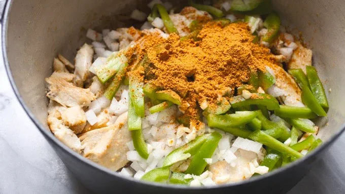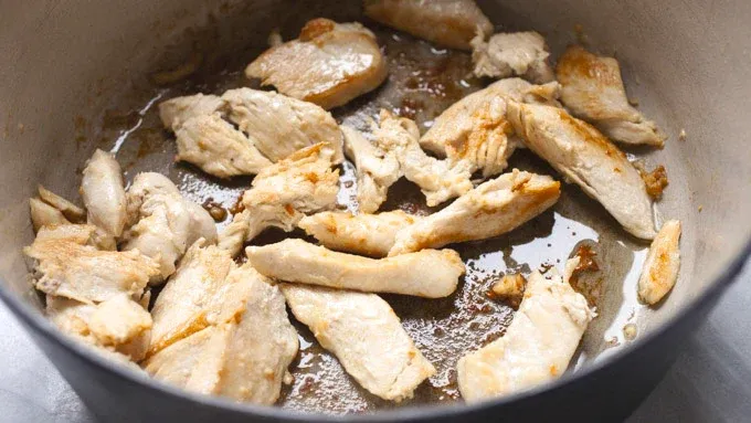 In the same pot, add olive oil over medium heat. Add chicken and cook until chicken is cooked through, about 8 minutes, stirring occasionally. Use a large spoon or tongs to break up chicken as it cooks.