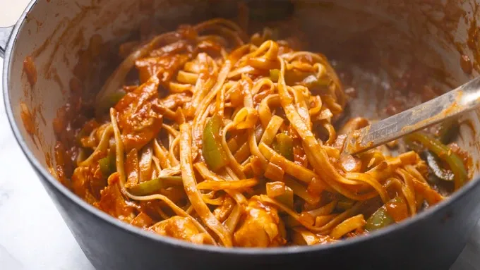 Add cooked fettuccine back into the pot and stir to combine. If the mixture looks dry, add water 1/4 cup at a time until the sauce is smooth.