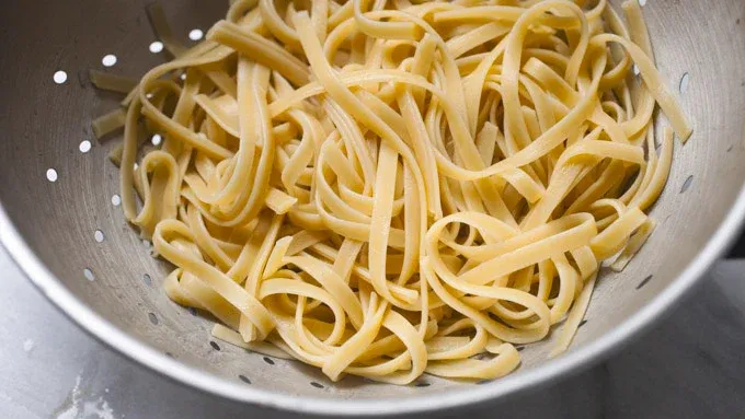 In a sturdy pot, cook fettuccine until it’s al dente in salted water. Drain pasta and toss pasta with cold water to stop the cooking.
