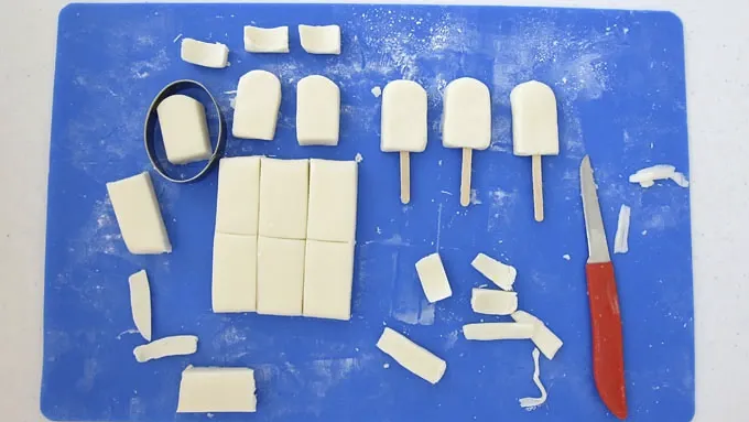 Step3Cut one end of each rectangle into a curved edge and flatten just a bit to create a Creamsicle™ shape. Rework the scraps and make two more Creamsicle™ candies. Allow the pieces to dry for 1 hour, then flip over and allow them to dry for another hour.