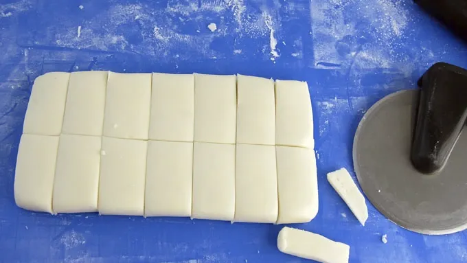 Step2Dust a non-stick silicone mat or a smooth cutting board with powdered sugar. Roll candy out into a 7- x 4-inch rectangle about 3/8-inch thick. Cut in half lengthwise, then cut into 14 x 2-inch rectangles. Refrigerate for 20 minutes. Remove and separate the rectangles.