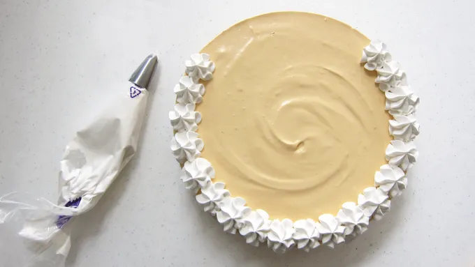 Cover with plastic wrap or foil and freeze for at least 4 hours. Remove cheesecake from springform pan. If desired, pipe on a border of whipped topping stars.