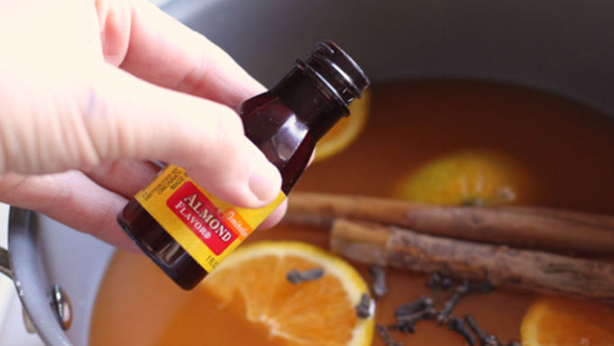 Step1Pour the juice concentrate into a large pot. Add 60 ounces of water (three juice-cans-full), then add the pumpkin pie spice, cinnamon sticks, orange slices, cloves, vanilla bean, and almond extract.