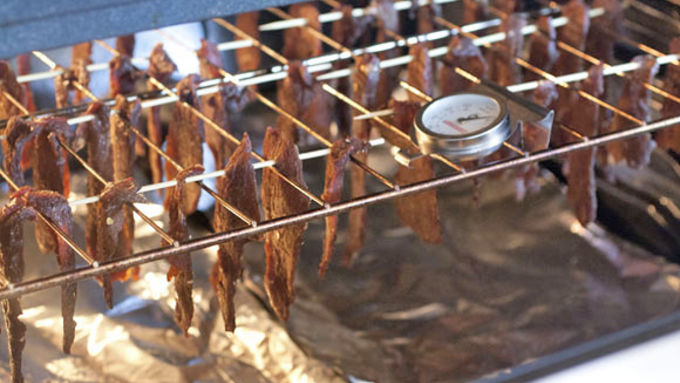 Step5Place your oven rack in the highest position possible and lay skewers across the rack so that the pieces of beef hang down between the grates. Put a few foil-lined baking sheets underneath to catch any drippings. Put oven on warm temperature (160-170°F) and stick an oven thermometer in there just to make sure your temperature is right. Crack the oven door open with a towel so moisture can escape, and cook 10-12 hours.