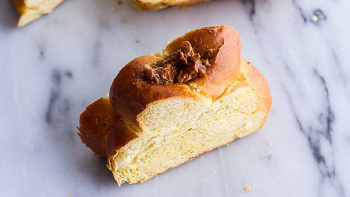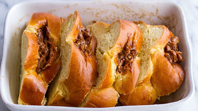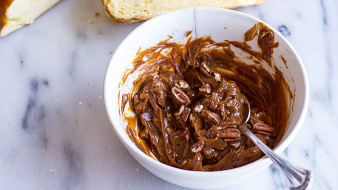 Step3Using a paring knife, carefully make an inch (or so) incision in the tops of each slice of bread to create a pocket. Smear the insides of the pockets with 1 1/2 tablespoons (or more if you wish) of the caramel pecan mixture.
