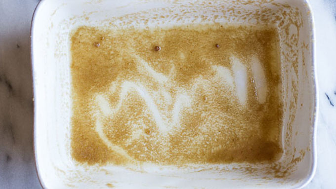 Step1In a small bowl, combine brown sugar and melted butter. Pour into the bottom of a 9x13 inch baking dish.