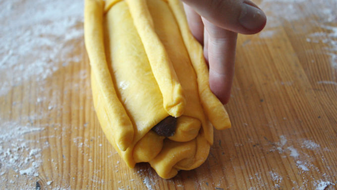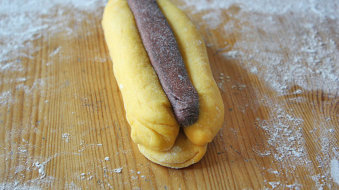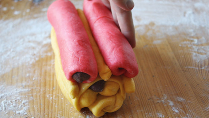 Step6Punch down risen dough and turn out onto a lightly floured surface. Cut off a small piece of yellow dough and stretch it to form the base of the dough (it should be about 7 inches long, 2-3 inches wide). Roll out two more equal pieces of yellow dough into 7-inch logs to form the rest of the base. Place both logs parallel to each other on top of base, using a little bit of water on your fingers to help the dough adhere.