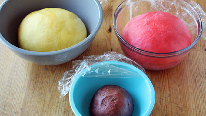 Step5Add red food coloring to one larger piece, yellow to the other larger piece and brown to the small piece. Knead in food coloring either by hand or in stand mixer (clean out bowl thoroughly between colors). Place dough pieces in three separate lightly greased bowls, cover with plastic wrap and let rise until doubled, about 1 1/2 to 2 hours.