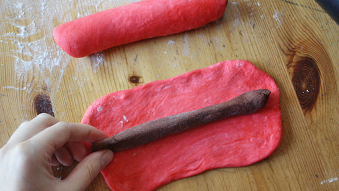 Step10Cut off a little less than half the red dough and cut that piece in half. Roll out each piece to a thin rectangle, about 7 inches long and 4 inches wide. Divide remaining brown dough in half and roll each piece into a 7-inch log. Place one brown log in the center of each red rectangle, lengthwise. Roll up red dough around brown dough to form a log.