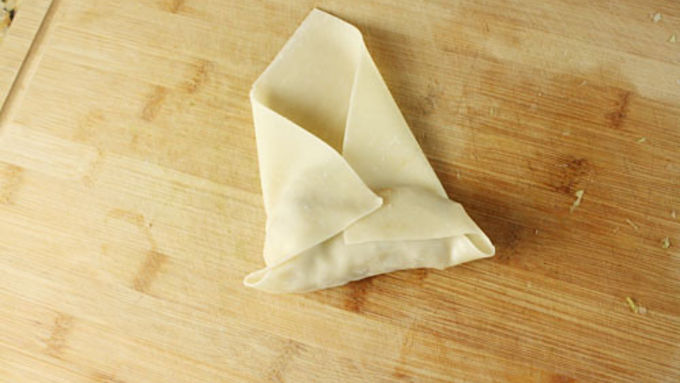 Step12Fold the point closest to you over the filling, then tuck in the edges and continue to roll. Try to make sure no filling is poking out and egg roll is nice and tight.